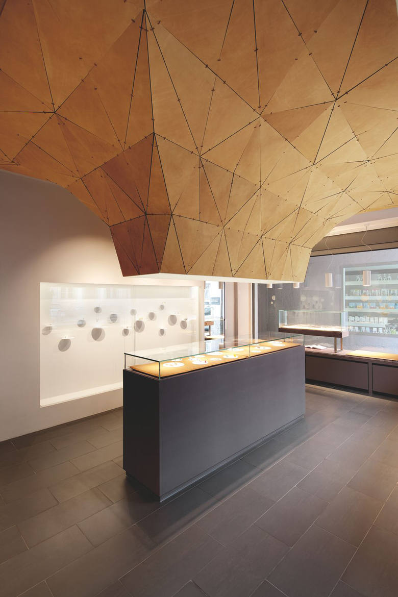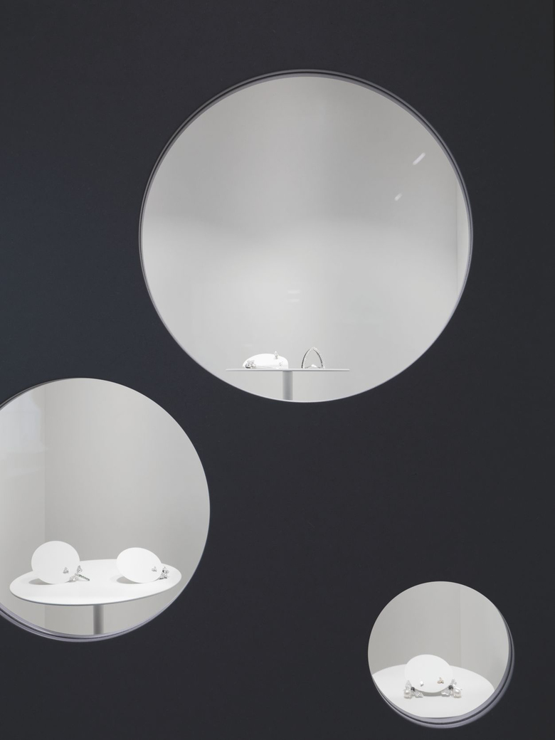 Die Umgebung nimmt sich zurück in Grautönen, während die Schmuckstücke in hell erleuchteten Wandvitrinen präsentiert werden. Die runden Ausschnitte in der Wand sowie die Plates in der Vitrine focusieren auf die Preziosen und spielen mit der Strenge des Interieurs.