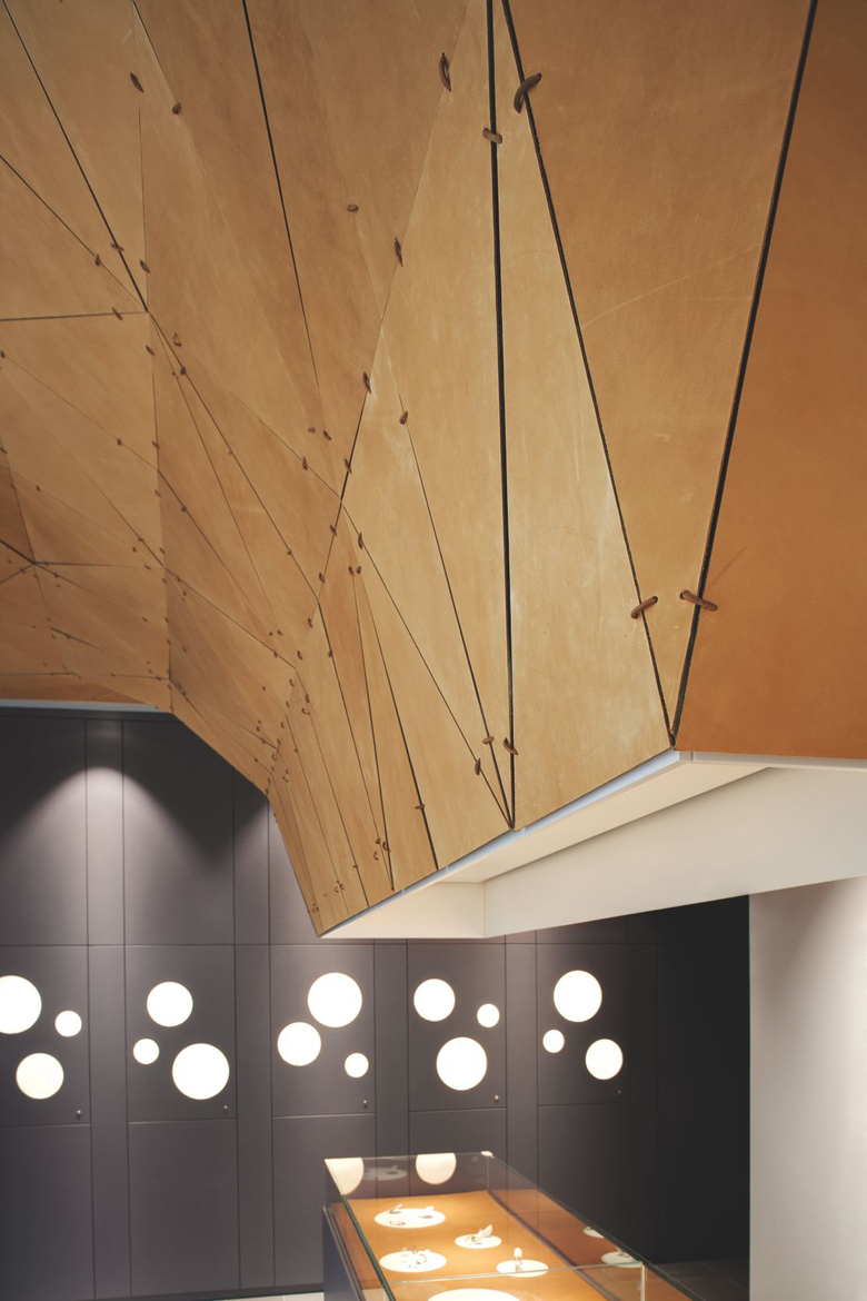Nachdem Juwelen immer direkt auf der Haut getragen werden, wird das Material der Wahl für diesen Store auch Haut, sprich naturfarbenes Leder. Es umhüllt die zentrale Skulptur des Drops, der in der Mitte des Raumes von der Decke wächst. Seine Oberfläche fächert sich in 236 finiten Elementen auf, die einzeln mit Lederbändern untereinander verbunden sind.