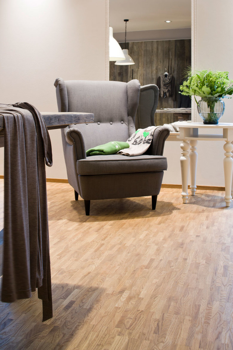 mit solidem Eichenparkett und dezent grauer Farbgebung des Altholzes verbindet sich alles zu einem einladenden Shop. Weiße, elegante Möbel und Leuchten setzen klare Kontraste. Dies alles bildet den Rahmen für chice, elegante und hochwertige Damenfashion, für Trüffelsucher und Lebensgenießer nicht in der City, sondern am Land!