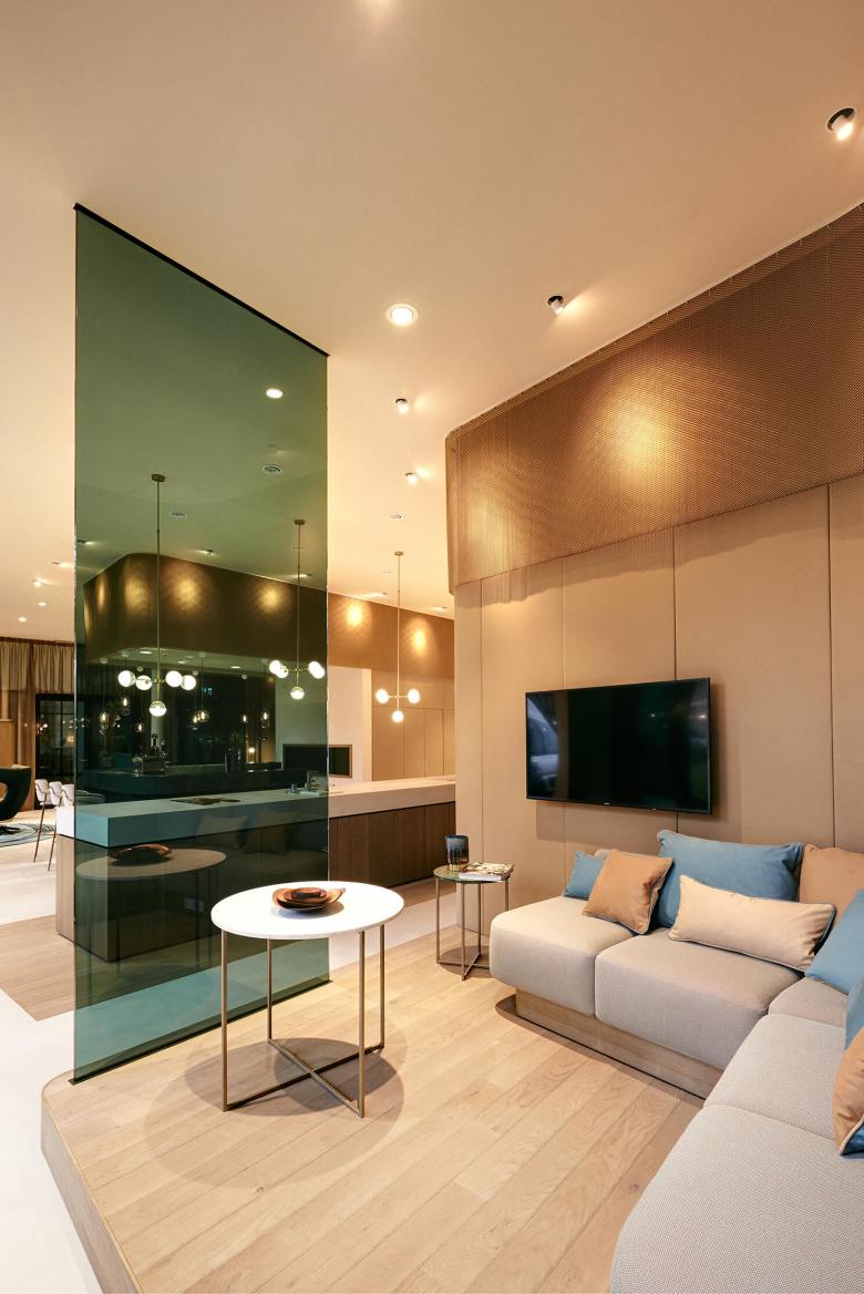 Der Showroom ist in eine Farb- und Materialwelt von weiß über messingfarben bis hin zu dschungelgrün getaucht. So werden die Besucher an der zentralen Cafébar aus dem grünen Marmor „Verde Guatemala“ empfangen. Der Metallvorhang aus Messingspiralen läuft die Decke entlang und erinnert an einem goldenen Horizont, dessen warme Lichtreflexion die Wohlfühlatmosphäre im gesamten Showroom prägt. Die einladende Weite der Fläche unterstreicht der weiße Estrichboden. Als Farbakzent blitzt immer wieder frisches Türkis auf. Als Teppich oder Sitzkissen macht es die Musik zwischen den warmen Farben und satten Oberflächen. Die Sitzgruppe mit den gemütlichen Sesseln gleich am Eingang erinnert an eine Kaminsituation. Hinter den raumhohen Glasscheiben aus getöntem Glas liegt luftigangeschlossen ein großer Konferenztisch und an anderer Stelle eine kleine Ecklounge. Hinter der gesprossten Glastrennwand wurde ein akustisch getrennter Konferenzbereich eingebaut,der Diskretion garantiert. Die lange Bench aus Echtholz präsentiert die Produktauswahl der verbauten Materialien und Oberflächen.