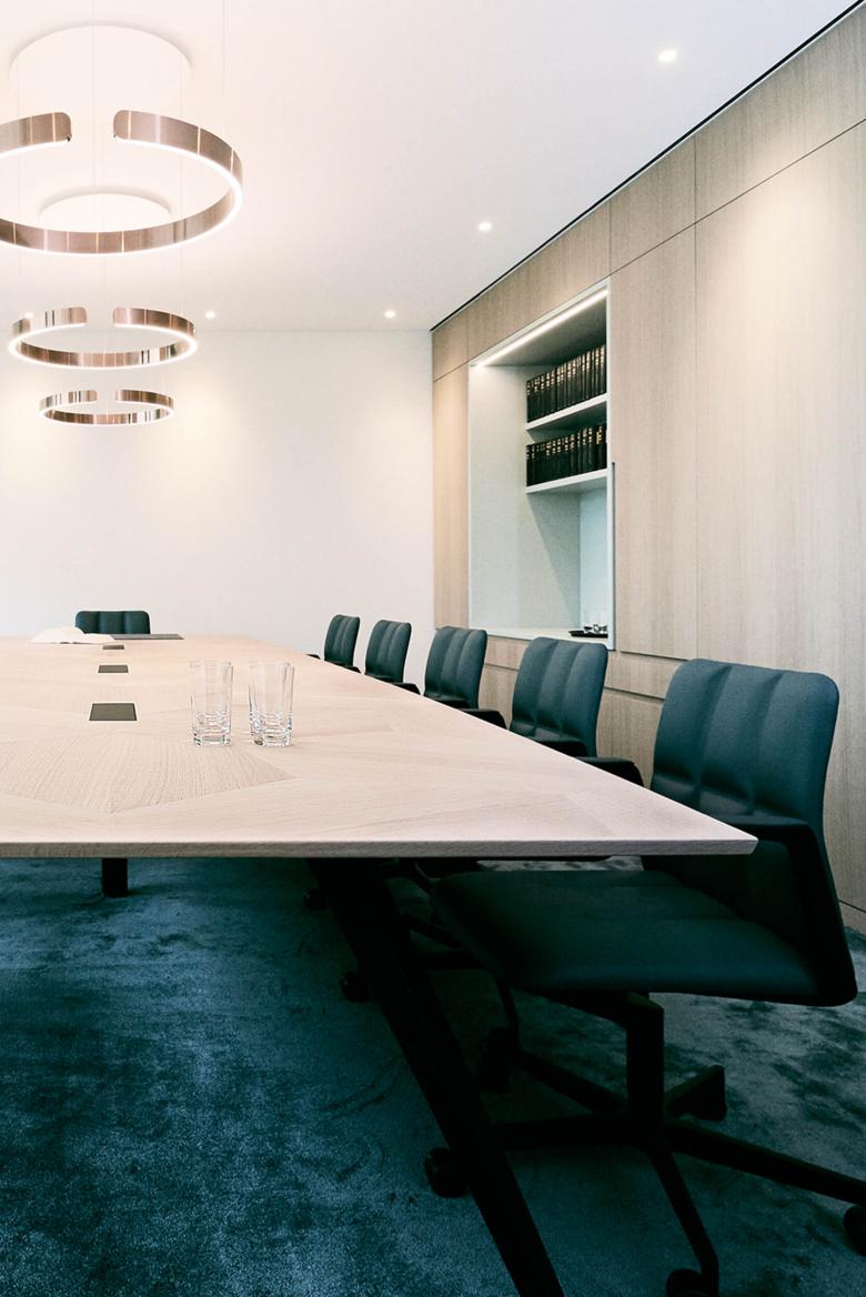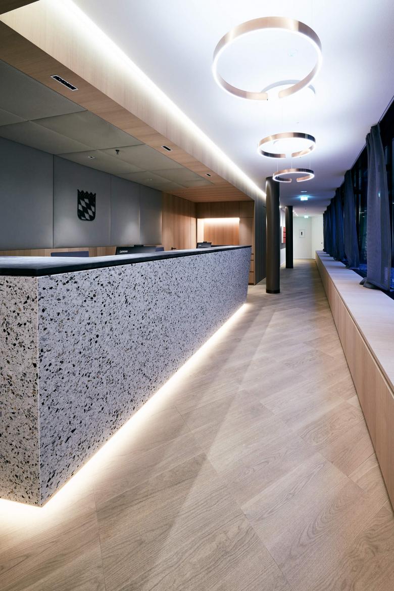 Die Feinabstimmung von Material, Oberfläche und Innenausbau waren in diesem Projekt die Aufgabenschwerpunkte. Auf die grundlegende Planung der Kollegen von „Freetech“ aufbauend, wurde der Materialkanon und die Farbwelt für die Kanzlei differenziert aufgefächert. Es galt die Balance zu finden für die hochwertigen Ausbauten und die Platzierung von Kunstobjekten. Eleganz, Leichtigkeit und Modernität wurde kombiniert mit dem seriösen Erscheinungsbild eines Notars. Heller Terrazzo, luftig-textile Raumteiler und das wertige Besprechungsmobiliar in Leder und Eiche empfangen die Kanzleibesucher. Dezente Farb- und Musterakzente bespielen den Office-Trakt, der sich über ein offenes Bistro mit Café-Theke angliedert.