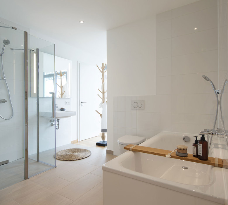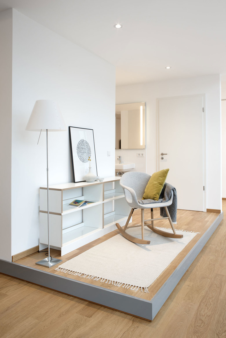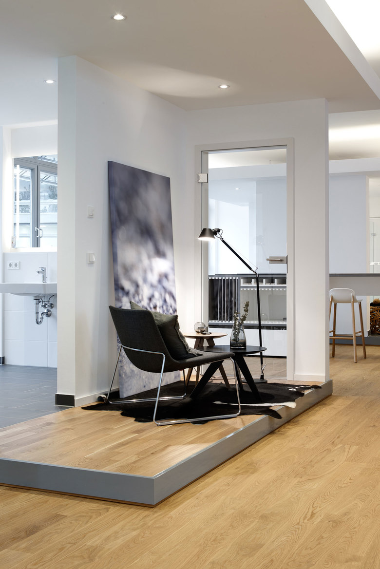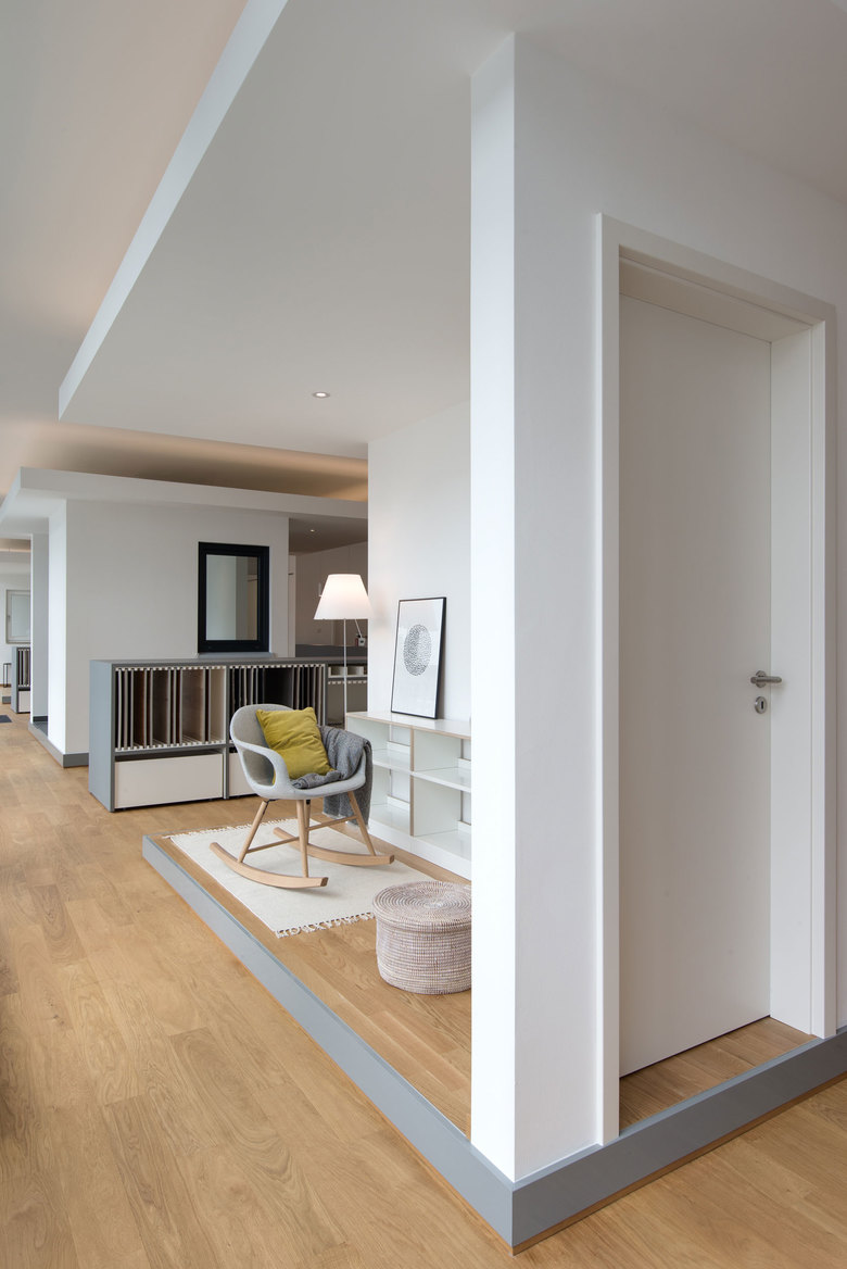 Der Showroom präsentiert drei abgestimmte Wohninseln, die als Besprechungsgrundlage für weitere Bemusterungen dienen. Die Kombination von Böden mit Tür- und Fensterelementen, sowie eingebaute Bäder vermittelt die Raumqualität der Immobilie als Ganzes. Die Kunden erleben einen echten 3 dimensional gebauten Ausschnitt ihrer neuen Wohnung und können mit dieser Grundlage besser entscheiden.