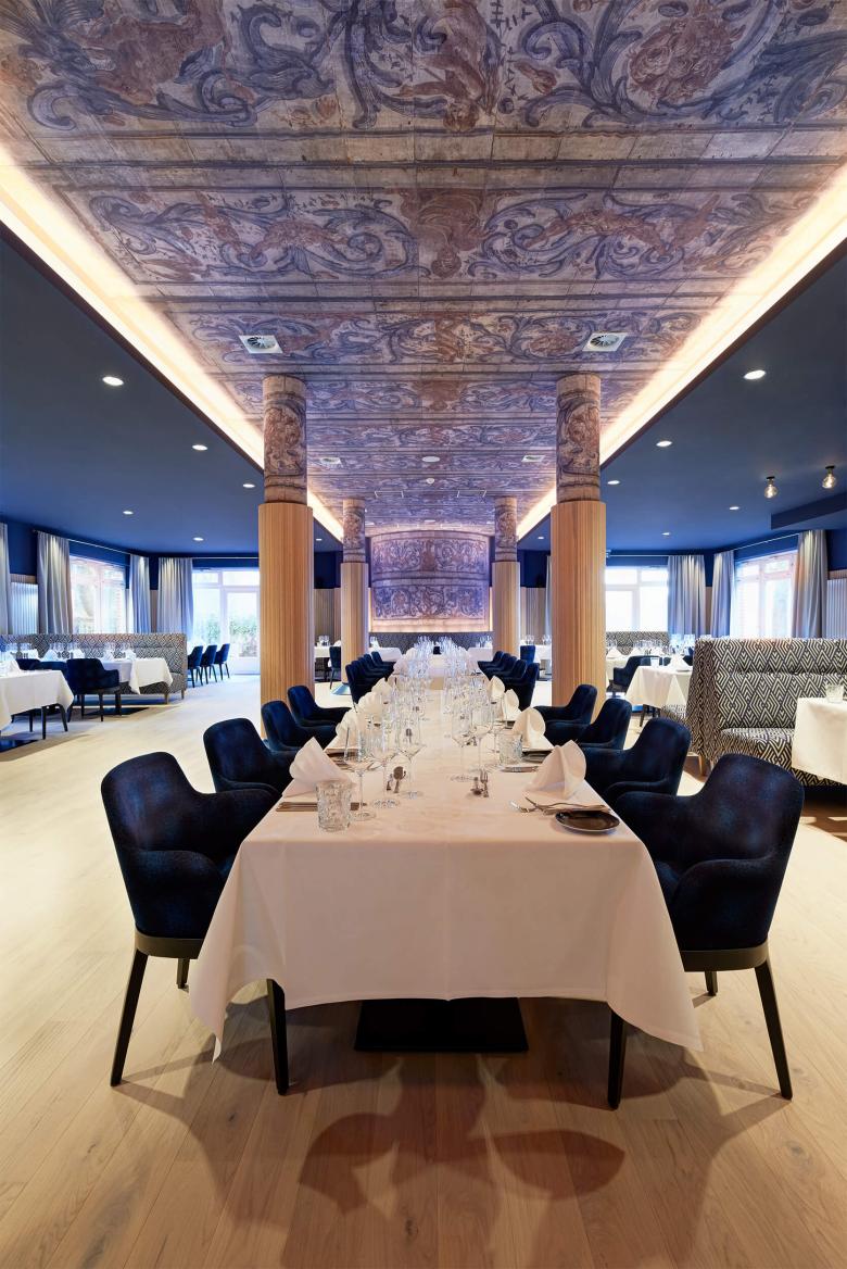 Aus der Schatztruhe des Museums für Hamburgische Geschichte durfte dankenswerterweise das Deckenmotiv aus dem Haus Grimm 31 entliehen werden. Die Restaurationsabteilung stellte die Fotodokumentation der „unterm Boden vermalten“ Dielen aus der 2. Hälfte des 17. Jahrhunderts zur Verfügung. Daraus wurden zwei Motive rekonstruiert und als Tapete nachgedruckt. Der Flair und die Themen dieser historischen Malereien spiegeln das genüssliche Leben wieder und erzählen mit etwas Spott und Ironie die Geschichte eines Hamburger Kaufmanns. Die Themen sind also unverändert aktuell – auf dass sich auch 330 Jahre später die Gäste daran erfreuen!