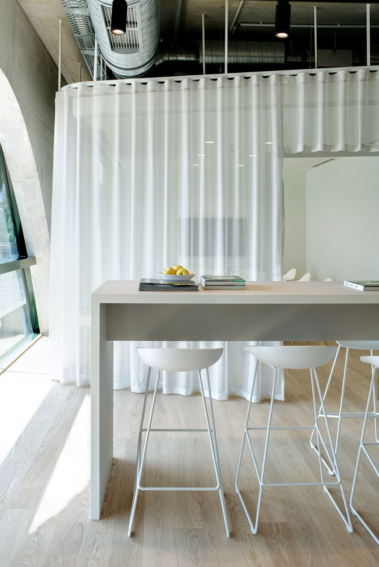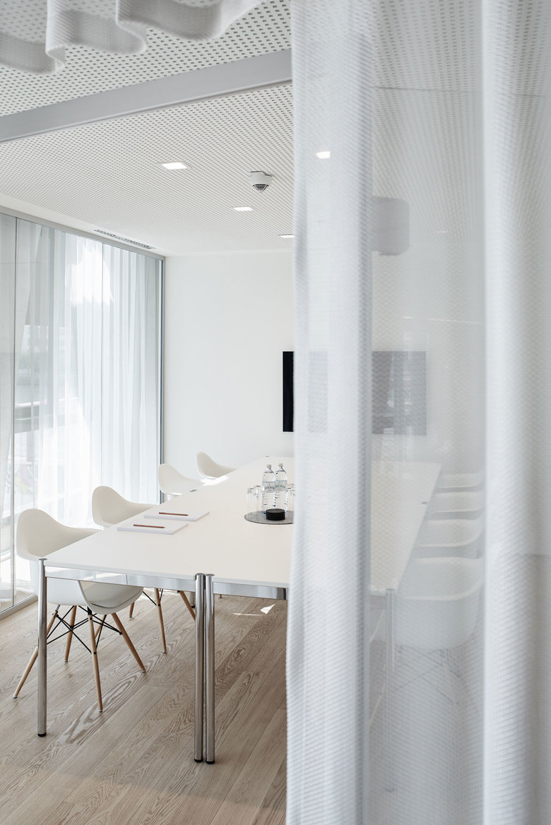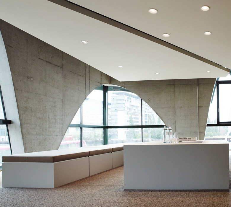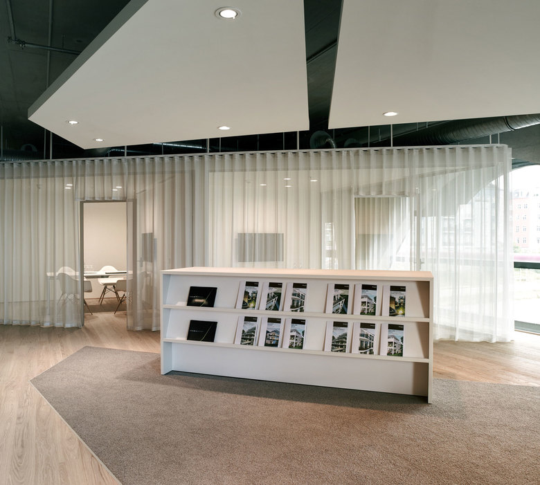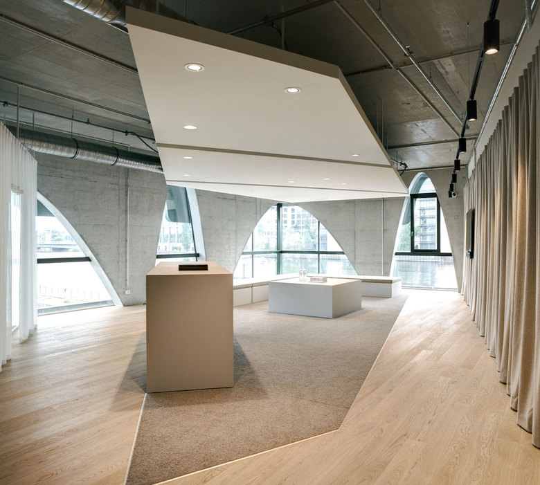 Losgelöst von der Fassade gliedern sich polygonale Räume aneinander, getrennt durch Glastrennwände mit textilen Vorhangelementen. Der schroffe Sichtbeton erhält ein wohnliches Gegenüber mit Holzdielenboden, Teppichzonen und eine individuell angepasste Beleuchtung. Das zukünftige Wohnen an der Spree lässt sich im Showroom bereits bestens erahnen...und erwerben.