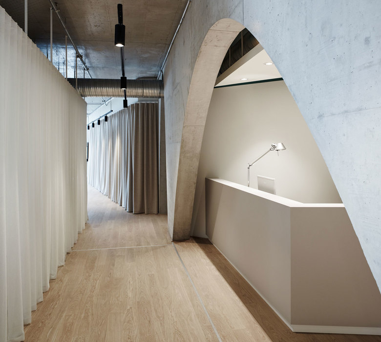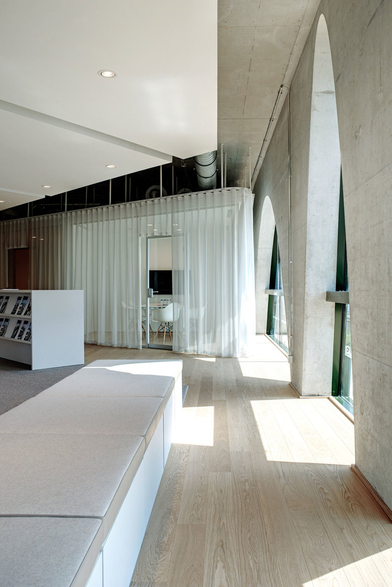 Direkt an der Spree liegt das Projekt und der neue Showroom. Die raumprägende Fassade mit den Bogenfenstern gab für die Innenraumgestaltung den Ton an. Es galt eine eigenständige Welt zu entwickeln, die weder in Konkurrenz tritt noch untergeht neben dem Bestand.