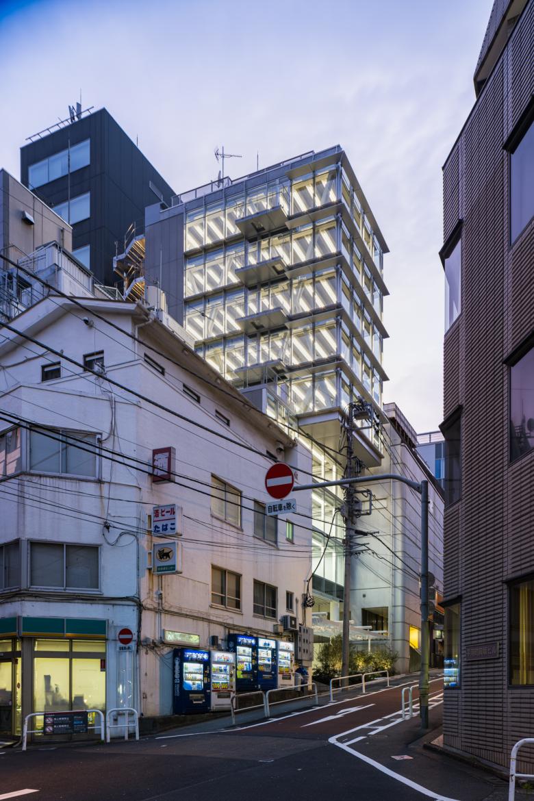 表通りからは一本入った、麹町から永田町に向かって下る貝坂の途中に敷地はある。周辺の道路、地形、土地の区画を観察すると、敷地の南側の上空には大きな空所が広がり、かつ隣地は2方向から道路斜線を受けて高い建物が建てられないことが分かったので、計画する事務所ビルの上部は南に間口を大きく構えることを考えた。一方で低層部については四方を建物に囲まれることから、平面をL型に屈曲させてできるだけ前面道路側のマンションから距離を取るようにした。天空率によって道路斜線をかわしつつ、先ずこのような低層部と高層部がズレるボリュームの構成が導かれた。