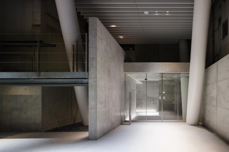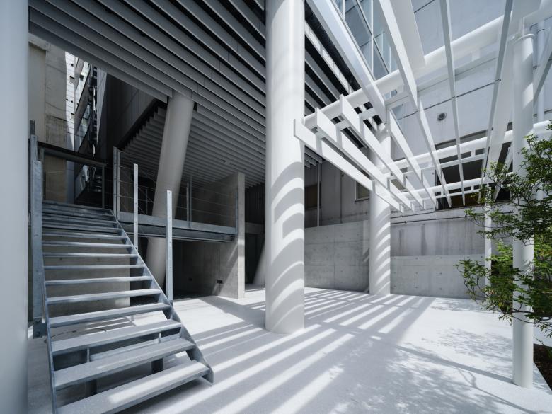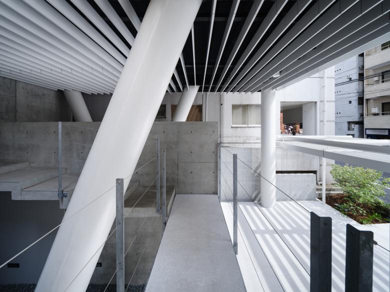 また前面道路からのアプローチで1階エントランス空間が相対的に高すぎるように思えたので、全体の架構から独立した斜め柱が貫通するRCの箱を挿入し、建物前面にはルーバー状の庇を道路近くまで突き出している。坂道に対して水平な庇は地形を顕在化させ、また低層部では道路から引っ込んだこの建物のゲートとして動線を導いている。
