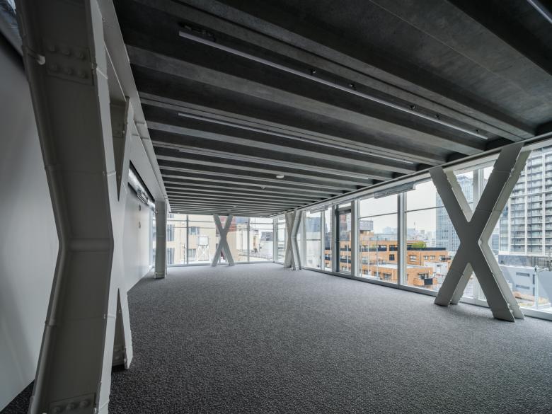 1階に2層分の階高があることから、2階以上の階は階高2800mmに抑えられている。床にリブ形状のPC合成スラブを採用して梁の内側に落とし込み、そのまま現しの天井とすることによりリブ下端で2400mmの事務所空間としての天井高を確保している。
