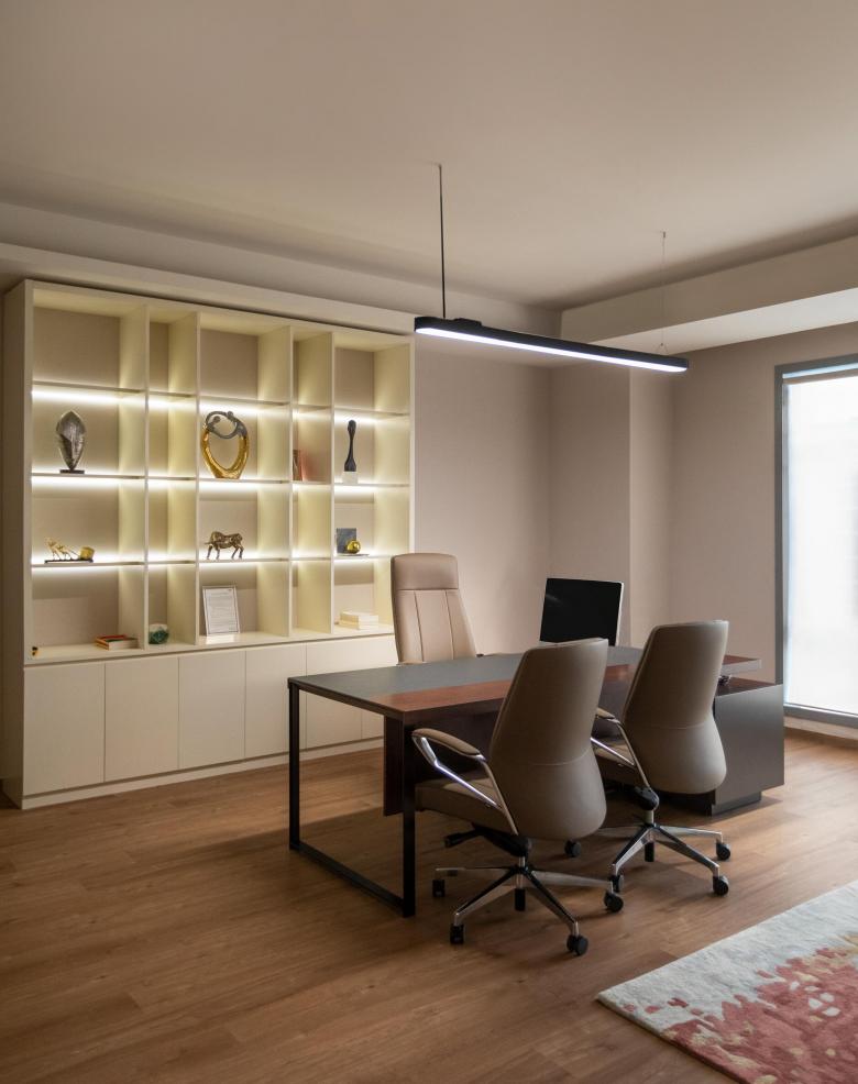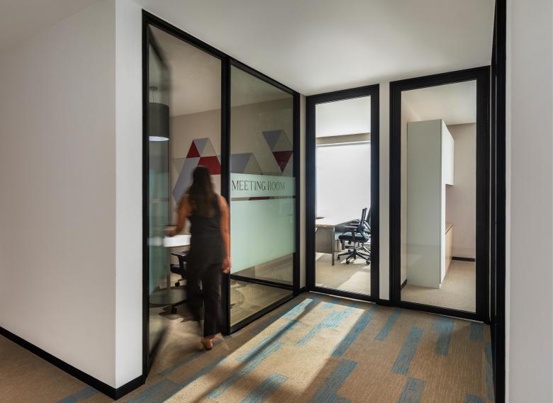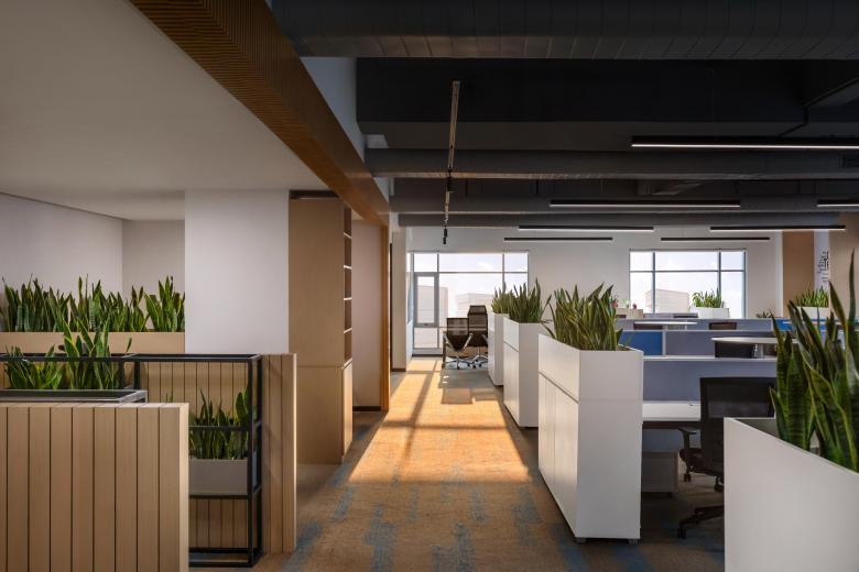 working areas enjoy natural light, augmented by daylight sensors in the main workspace. Occupancy sensors optimize energy consumption in enclosed areas, resulting in nearly 50% less energy usage compared to conventional workspaces. The office further embraces energy-efficient LED lighting, motion sensors, and water-conserving plumbing fixtures.