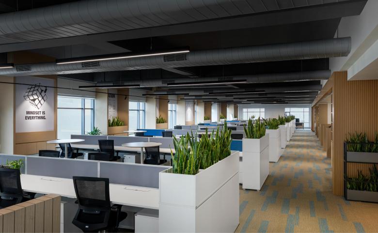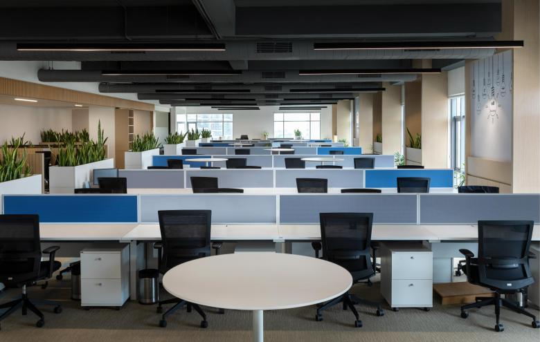The design process focused on maximizing daylight, reducing dependency on mechanical means of lighting and ventilation. Service areas, such as the pantry, kitchen, toilets, AHU, and IT rooms, are clustered around the central circulation core. Meeting rooms requiring controlled lighting conditions are planned adjacent to the core. The directors’ and CEO’s cabins are planned along the south-western edge, in compliance with Vaastu principles, while collaborative workstations