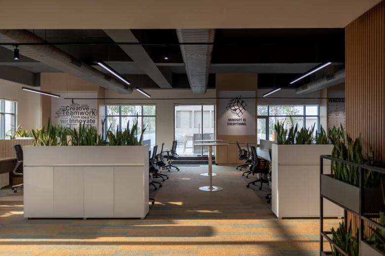 A pivotal focus in the design process was ensuring employee wellness. To support this, spaces have been planned to inspire health and productivity, providing ample natural daylight and circulation. The transition space between reception and workstations was transformed into a 'Zen space,' featuring indoor plants and a calming feature wall. Primary workstations align along the building's perimeter, while carefully positioned work desks prevent glare in the main workspace. An outdoor terrace serves as a versatile working space, breakout, and events area for employees.