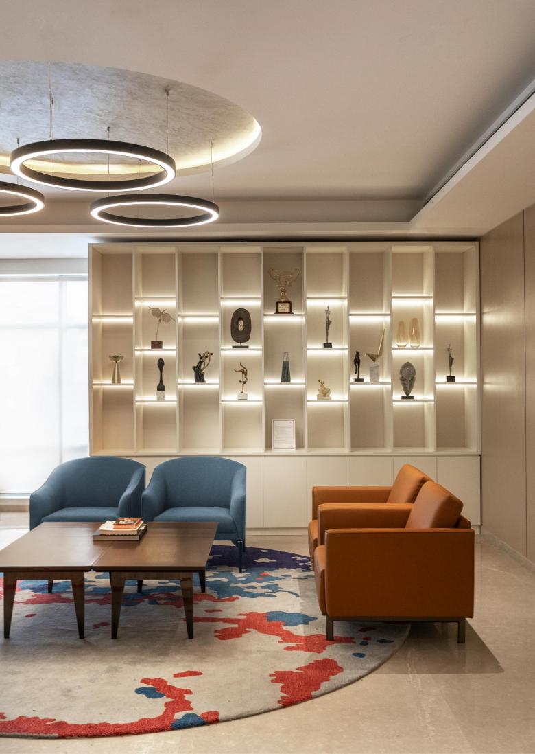 The architects personalized the modern office space for the Adani Group by integrating brand colors into its interiors. In summary, Adani Realty's Gurugram office shines as a fitting example of innovation, sustainability, and employee-centric design, elevating the standards for corporate workspaces globally.