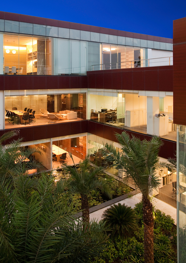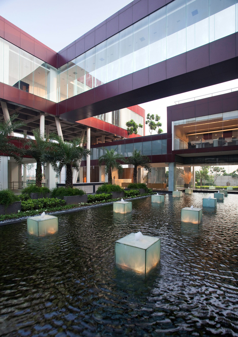 As is the nature of most custom designed corporate developments, the building had to exemplify the identity and corporate ideology of equity and transparency in the workplace as an integral part of the architectural vocabulary. Conceived as a solid perimeter scheme with a more fluid interior, the morphology blurs the interface between the inside and outside. The site surroundings and context along with an optimum enclosed square volume enabled a built form with minimum exposed surface area. The built form configured of 8m wide office bays optimizes the natural day lighting and helps to define the programmatic requirements of the office. A stacking system is used to generate a variety of open spaces; courtyards, verandahs, terraces, green roofs etc. that help to structure the office spaces. A central spine traversing the built volume serves as the common activity zone, with other departments branching out. The design’s conceptual strength comes from the spatial organization which creates overlaps between the exterior and the interior and between the various programmatic requirements, hence creating a vibrant and creative work environment.