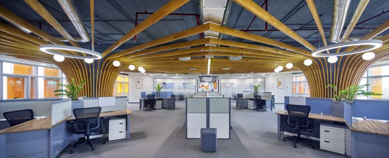 The Offshore Development Centres (ODC) are designed with high levels of efficiency. Roughly twenty percent of the area is dedicated to circulation cores, and eighty per cent reserved for workspaces. The diverse programme includes collaborative workstations, conference rooms, break-out areas, and office pods.