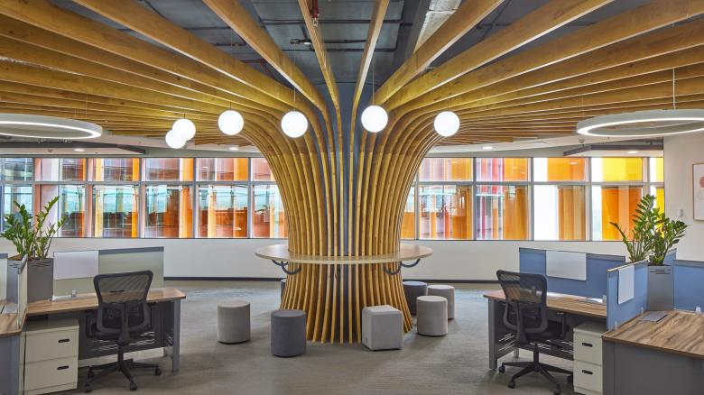 Each workspace is uniquely designed using a myriad of materials—and is characterised by a distinct shift in flooring patterns, adaptable furniture such as high stools, tables, etc., and a diverse colour palette. Amenities like gyms and relaxation pockets are included in the programme to promote health and well-being.