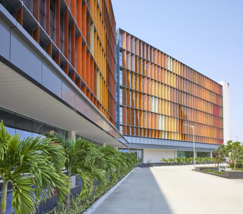 Vertical fins are strategically oriented at varying angles along the entire length of the facades to regulate ingress of light. The base hue for the fins is orange, and earthy tones are added to develop a gradient. The design is inspired by the seven swaras (Indian classical music notes) and adds a sense of rhythm and visual dynamism to the building exterior.