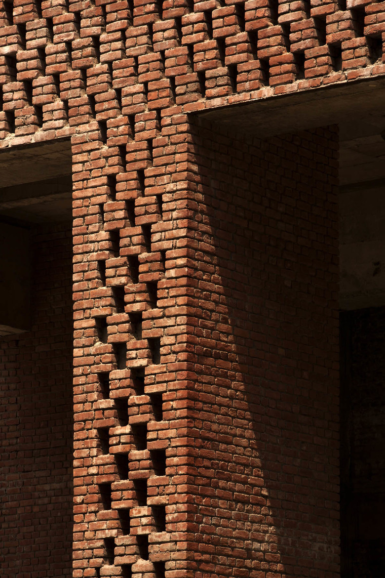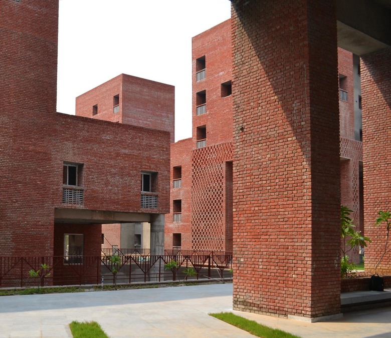 External conditions for most of the year make open spaces inhabitable; hence there is a great need for modifying the microclimate. A comprehensive environmental strategy is adopted to ensure the protection of the building from extreme climatic conditions. A compact built form that reduces heat gain is maintained taking care that optimum daylight and cross-ventilation in all the units are maintained. Deep recessed windows are provided for shading and help in controlling optimum day lighting. The facades are designed as the interface between the interior conditioned space and the outside environment and act as insulators and light filters to control and modulate inside conditions. The use of brick, brick jaalis and other simple finishes helps to maintain a simplistic material palette. The courtyards generate a micro-climate through water bodies and shading. All materials are sourced from within 500km of the site.
