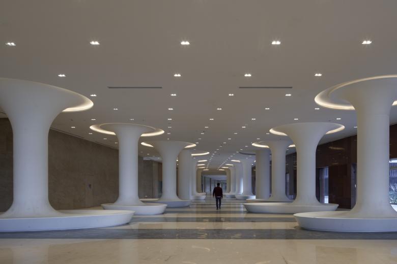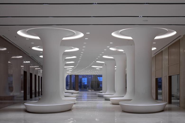 A linear circulation spine anchors the building, connecting it horizontally and vertically across all levels. The spine flares out at both ends to funnel in the prevailing winds. The Diamond Club sits as a monolithic insert on the site’s northwest, extending from the free-flowing walls of the spine and taking advantage of the frontage for maximum visibility. Nine office towers diverge from the central spine; they are interspersed with shaded courtyards for rest and recreation that can remain in use year-round. The 15-storey office towers are oriented north-south, screening the harsh western sun and enabling 75% of the workspaces to be filled with diffused light throughout the day.