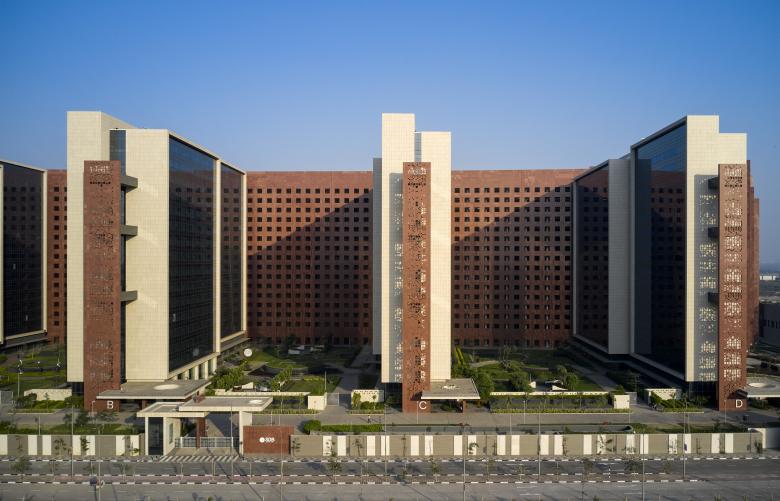 The N-S orientation of the office blocks and narrow floor plates ensure 75% day-lit offices. These measures have resulted in a 15% saving in Cap-ex, a 50% saving in Op-ex, and a 50% reduction in energy consumption compared to the highest green rating standards, with a performance of approximately 45 kWh/sq.m./yr compared to the Energy Conservation Building Code's benchmark of 110 kWh/sq.m./yr.