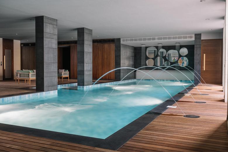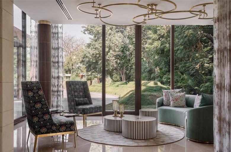 The design scheme for the interiors revolves around the five elements of nature: fire, water, air, earth, and flora. Leaf-patterned screens and sheer curtains and columns cladded with fluted wood emulate the spirit of a forest. Warm neutrals and earth tones characterise the master bedroom, whereas delicate, airy pinks and whites inspire the daughter’s bedroom. The feature walls and material palette in the kitchen are centred around fire, while a water body encompasses the pooja room. A combination of patterned and plain wooden flooring and beige stone flooring further inject warmth into the interiors. Cultural elements like jhulas dot intimate corners yielding an unmistakably Indian character to the spaces to create a sense of home.