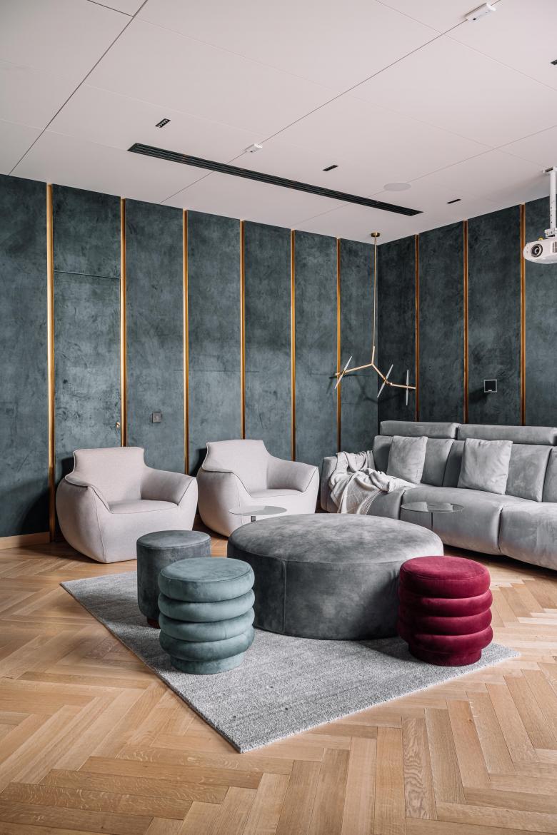 Taking cues from the works of modernist icons such as Louis Kahn and Le Corbusier, the facade is an amalgamation of concrete, HPL wood and Dholpur stone. The external material palette continues to the interior through a monolithic structural wall clad in stone, establishing a vista through the continuity in the material.
