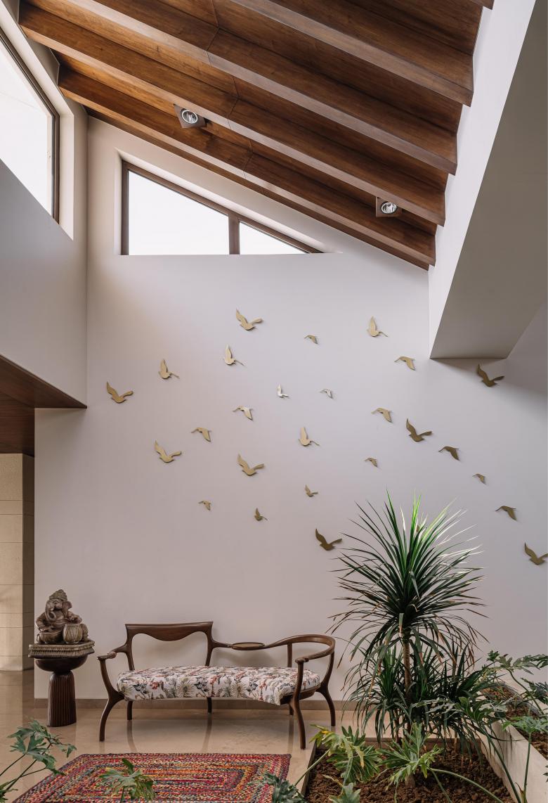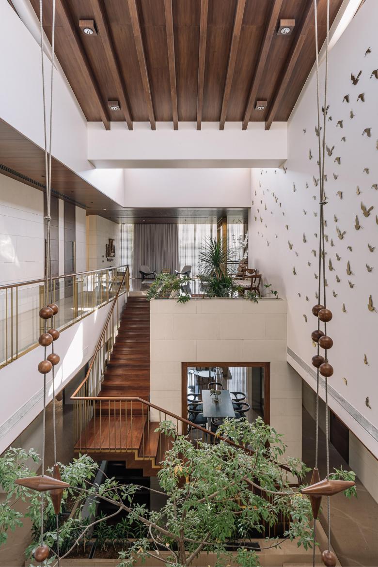 All spaces are designed in compliance with the science of Vaastu. The home is planned axially with three courtyards across different levels, and this interplay of stepped levels has been derived from the design of regional baolis or step-wells. A welcoming double-height atrium gives way to a double-height communal courtyard with a Kalpataru tree–the central element along the north-south axis on the ground floor. This axis visually connects the approach mound and drop- off area to the indoor and alfresco dining areas. Beyond the atrium, a crisscross tile pattern, an expression of the regional bandhani textile, demarcates an area to establish a sense of pause. The essence of the house is captured in this spot by a suspended kite installation inspired by Gujarat's kite flying traditions and a louvred skylight that pulls daylight into the home. The skylight is integrated with a butterfly roof, enabling stack effect to naturally cool the interiors. The pooja area exudes a spiritual undertone, with a serene water body adjoining the courtyard and representing its close connection to nature. Along with being the social heart of the home, the well-lit courtyard is also designed to serve as a space to display sculptures and other artworks, as the family plans on developing an art collection over the years. Provisions are made for the artworks to be suspended, becoming an intrinsic part of the space.