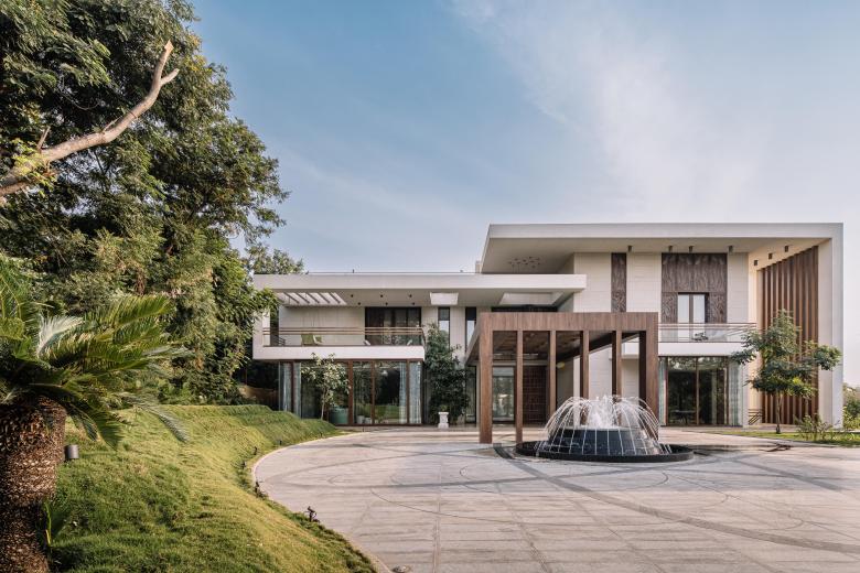 The clients, owners of a leading tea conglomerate, wanted a home that has an iconic presence and blends with nature. Located on a one-acre plot, the home is surrounded by a verdant landscape of Gulmohar, ficus, Rudraksha and Bakul trees. It draws inspiration from Gujarat's culture and architectural vocabulary to express the family's values, outlook, and way of life.