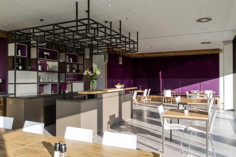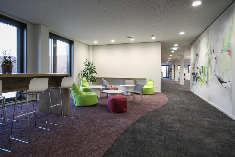 Das Innenraumkonzept ist großzügig, transparent und unterstützt mit wohnlich gestalteten Treffpunkten eine offene Kommunikation. So können sich im Erdgeschoss sowie in der Kantine nicht nur die Mitarbeiter aus unterschiedlichen Bereichen durchmischen, sondern auch Besucher und Kunden der Schulungsräume. Besonders inspirierend ist auch die große F&E-Abteilung im ersten Obergeschoss, in der sich in sonnigen Räumen in die Zukunft denken lässt.
