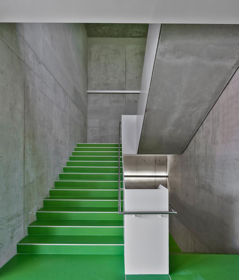 Eine großzügige Außentreppe, die direkt vom Donauuferweg kommt, führt zum Eingangsbereich. Die Innenräume sind flexibel und offen gestaltet und bieten Möglichkeiten für Kommunikation und Kreativität. Die wichtigste Basis einer Hochschule. Große Teile des Baus sind in Sichtbeton realisiert, der den Ideen-Werkstatt-Charakter unterstreicht. In der weißen Mosaikfassade spiegeln sich funkelnd Wetter und Passanten und lassen sie so lebendig werden.