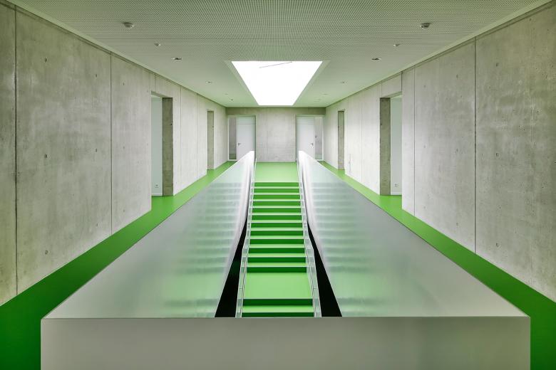 Durch Überlagerungen der Baukörper entstehen horizontale Auskragungen und Einschnitte. Das neue Gebäude der HfK+G gliedert sich in drei Ebenen, die sich in unterschiedlichen Richtungen orientieren. Durch Überlagerungen der Baukörper entstehen horizontale Auskragungen und Einschnitte, die Räume und Zugänge deutlich markieren und durch Lichthöfe vertikale Verbindungen entstehen lassen.