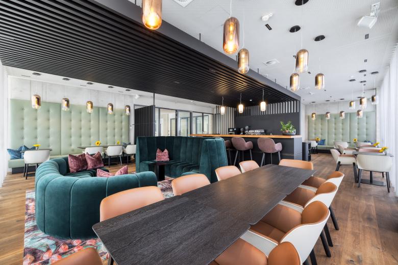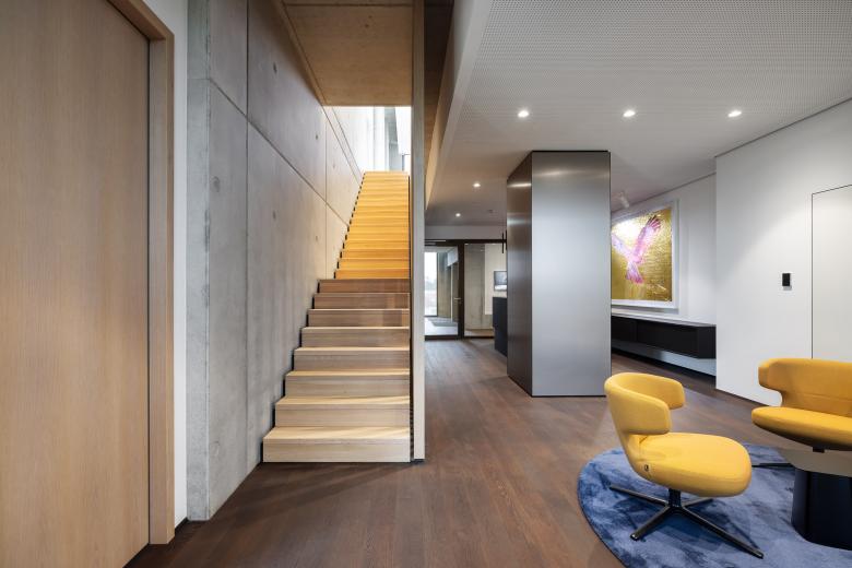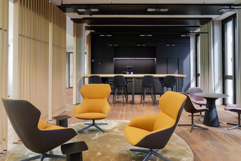 Die Umnutzung des ehemaligen Hochschulgebäudes mit seinen tiefen Klassenzimmern erforderte ein differenziertes Raumkonzept. Einzelarbeitsplätze entlang der Fassade nutzen Tageslicht und Ausblick, innenliegende Zonen dienen Besprechungen und Think Tanks. Im Innenraum verbindet sich die kontrastreiche Architektur zu einer gemeinsamen Sprache: Sichtbeton trifft auf hochwertige schwarzmatte Oberflächen, Strenge auf Wärme.