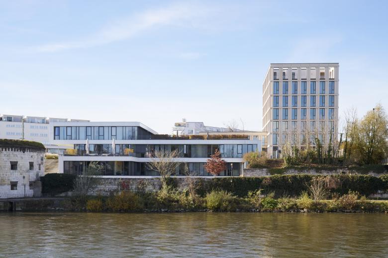 Der Neubau markiert einen bewusst gesetzten städtebaulichen Akzent an exponierter Lage. Von der Donau erscheint er als Teil der Uferlandschaft, hin zur Innenstadt zitiert er in abstrahierter Form die Vertikalität des Ulmer Münsters. Durch die versetzte Anordnung entsteht ein Platz, der als Signal gegen die typische Abgeschlossenheit von Kanzleibauten steht. Wege und Freiflächen führen bis an die Gebäudekanten, ein öffentlich zugängliches Restaurant lädt die Stadt ein.