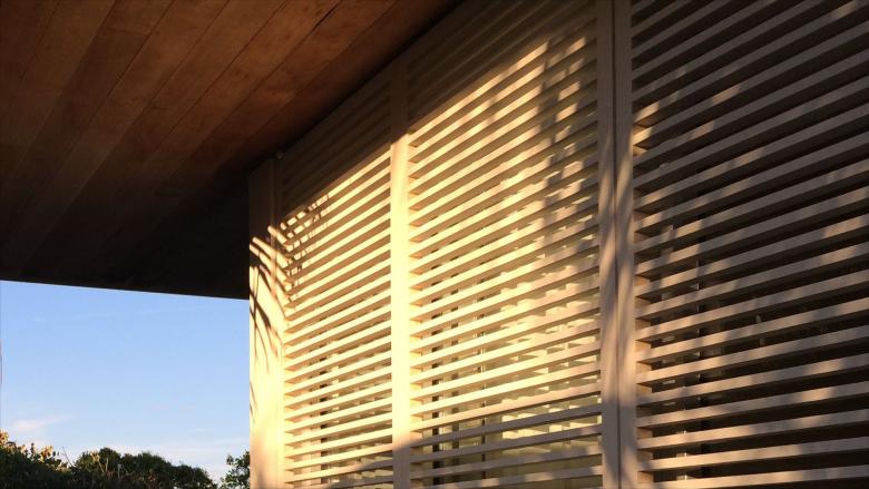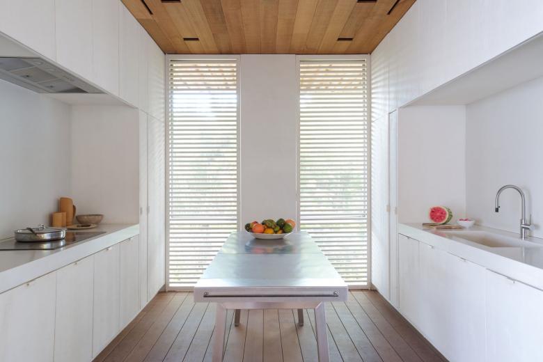 Im Gegensatz dazu sind die angrenzenden Schlafzimmer und Bäder von Fensterläden umhüllt, die ein sanftes, gefiltertes Licht und ein Gefühl von Privatsphäre schaffen.