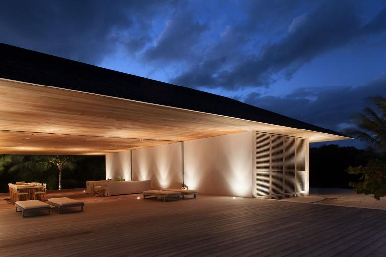 Aufgrund der Überlegungen zu Sturmfluten und dem Anstieg des Meeresspiegels haben wir das Haus 10 Meter (33 Fuß) über dem Meeresspiegel auf einer Sanddüne errichtet. Das große Schindeldach schützt eine interne „Veranda“, die sich durch das Zentrum des Hauses zieht – im Grunde ein offener Durchgang für frische Luft. Vom Land aus führen Treppen aus dem Dschungelboden zu diesem Hauptwohnraum, der einen spektakulären Blick auf das Meer eröffnet und die Menschen durch das Haus bis zur Düne und darüber hinaus zum Ozean führt.