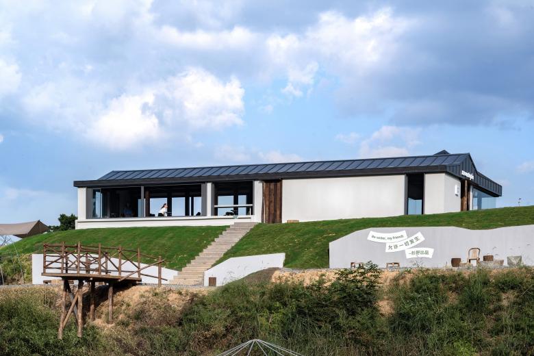 顺应杨梅园的自然地理形态,采用嵌入的方法在室外塑造出几块露天营业区,通过砌筑挡土墙、铺灰色砂砾石、使用原木加工的桌椅等方法来弱化这一片区对自然的入侵感,与周遭环境融为一体。