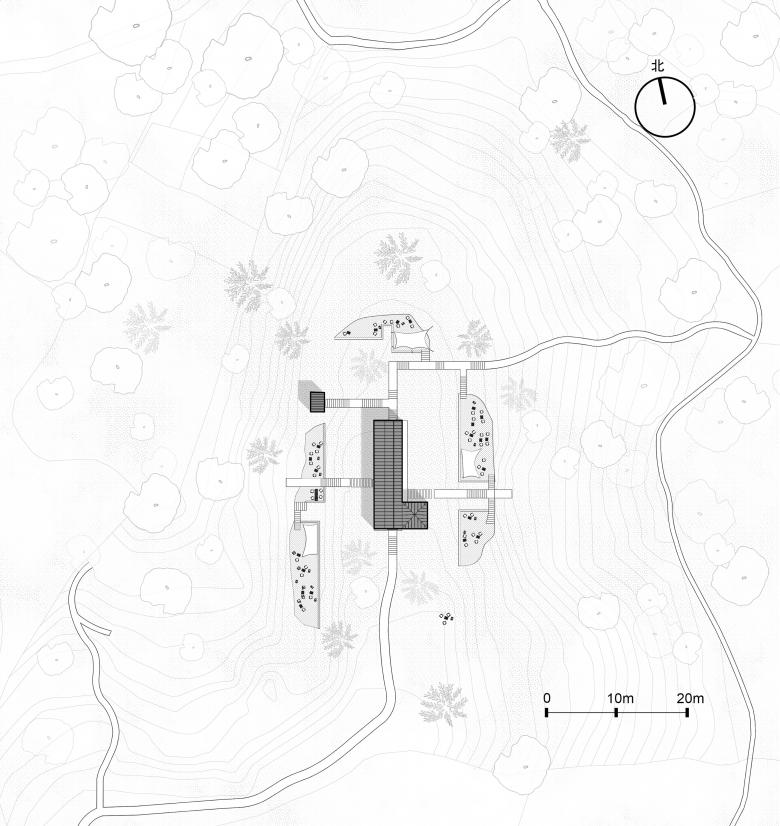 山系这一主题实际上是一个非常具有中国特色的命题。山系代表了中国传统人文情感的集中体现——追求避世之境。尽管在西方也存在隐士文化,但所谓的西方归隐是回归到原初状态,而中国的避世状态是身体虽远离尘嚣,但内心却追求更高层次的文化追求。这种状态很难以物质形式呈现,就如同王阳明所提到的“格物致知”:人性是无法改变的,而“意”与“行”之间存在着内在的联系。中国传统人文情感的核心思想或许就是追求这样的境界。因此,我们的愿景是在满足茶室基本功能需求的基础上,尽量简化并减少人们对物理空间的依赖,为使用者留出更多未被界定的、与自然融为一体的空间。这一点至关重要。因此,对环境的尊重与顺应成为我们方案的主要设计导向。山系茶室成为了人们进行“格物”的场所,这也正是我们建造它的初衷。