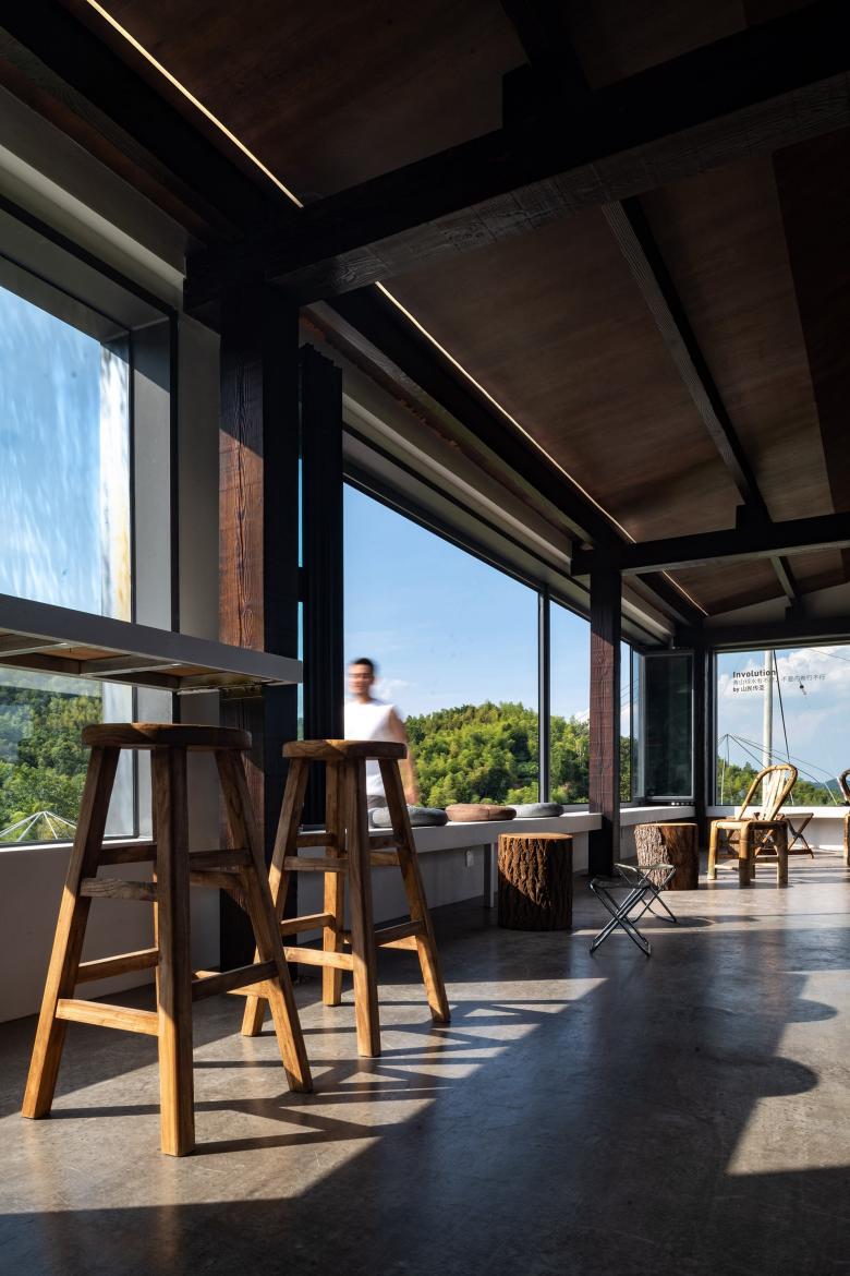 基于生态保护和修复的自然理念,室内外的家具、门和置物架均采用了当地的竹木材料进行现场制作。当阳光投射在这些风化后的老木材上时,展现出了特别自然的纹理和生动的颜色。在细腻和粗犷之间需要取得一种平衡,过于密集的细节可能让人感到不适,而过于粗糙的表面则可能显得简陋。因此,精确把握这种度和关系非常重要,同时,建筑师的个人感受也是关键因素,因为他们的每个决策都将影响建筑完成后的整体氛围。