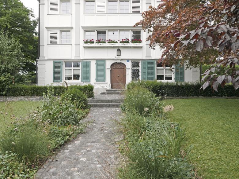 Das repräsentative Haus mit parkähnlichem Umschwung befindet sich in Teufen an der Speicherstrasse. Das ehemalige Landammannhaus und spätere Kinderheim steht unter Denkmalschutz. Von den neuen Besitzern wurde es sorgfältig renoviert. Die grossen Aussenflächen wurden etappenweise behutsam umgestaltet, wobei dem alten Baumbestand mit Kastanien, Schwarzkiefer, einer ausladenden Flügelnuss und vielen weiteren Solitärbäumen besondere Aufmerksamkeit zukam. Eine Pfasterung aus Innerschweizer Guber Naturstein bildet den Belag der Zufahrt und Zugangswege. Die Stützmauern wurden aus dem gleichen Naturstein realisiert. Unter dem Baumdach alter Kastanien wurde ein neuer Sitzplatz umgesetzt und eine weitere Sitzmöglichkeit wurde mit einer Pergola ergänzt. Neu angelegte Wildstaudenbeete begleiten zum eindrucksvollen Hauseingang. Ein historischer Gusseisenbrunnen und eine metallene Sitzbank wurden restauriert und in die Gartenanlage integriert, ebenso finden sich neu Skulpturen, ein antiker Brunnen und passende Aussenleuchten.