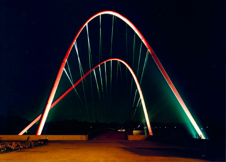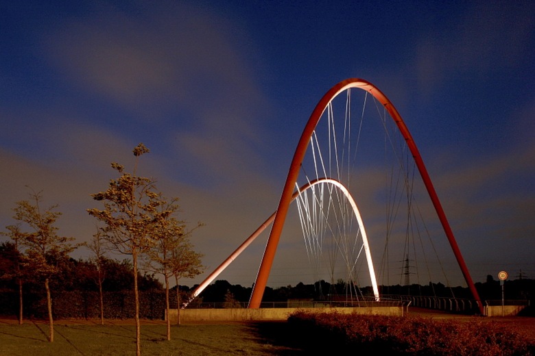 Die Brücke über den Rhein-Herne Kanal bildet innerhalb des BUGA-Geländes das wichtigste Bindeglied zwischen den für den Fußgängerverkehr seit mehr als hundert Jahren getrennten Stadtteilen Horst und Heßler. Die Brücke ist Teil eines Ensembles von fünf Brücken, dessen Baumaterial, Stahlrohr in unterschiedlichster Form, auf die Geschichte der Region und des Geländes Bezug nimmt. Historische Bogenbrücken entlang des Rhein-Herne-Kanals und der Emscher waren weitere vorgefundene Entwurfselemente. Die außergewöhnliche und asymmetrische Form der Brücke resultiert aus der langen Diagonalen der Haupterschließungsachse und dem Doppelbogen-Haupttragwerk, welches über die kürzeste Spannweite, das heißt rechtwinklig zum Kanal, ausgerichtet ist. Die Fahrbahn wird über Abspannseile abgehängt. Die Bögen, Primärfarbe BUGA-Rot, haben gleichzeitig eine Funktion als Portal, sowohl für die Schiffahrt als auch für die Fußgänger und Radfahrer. Die Brücke stellt eine begehbare Raumplastik mit großer Signifikanz dar.