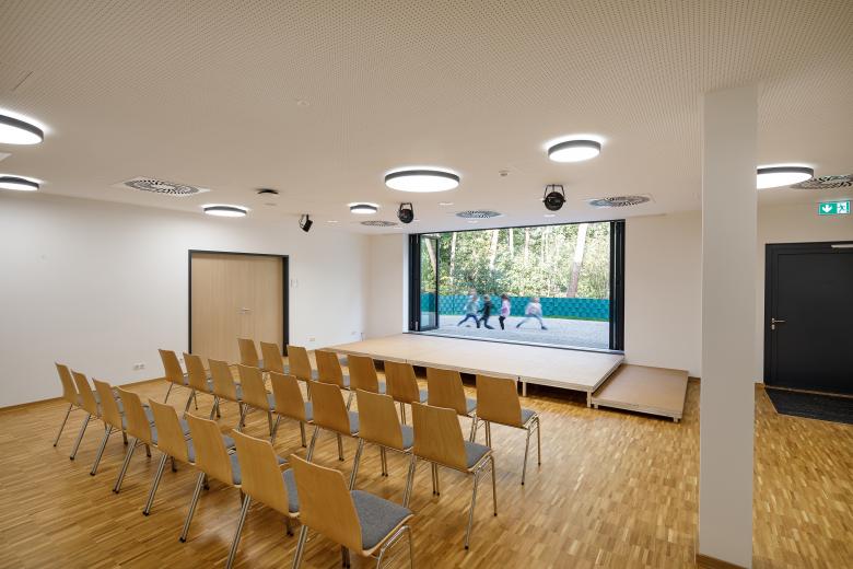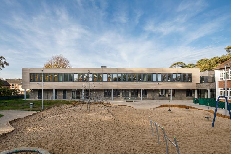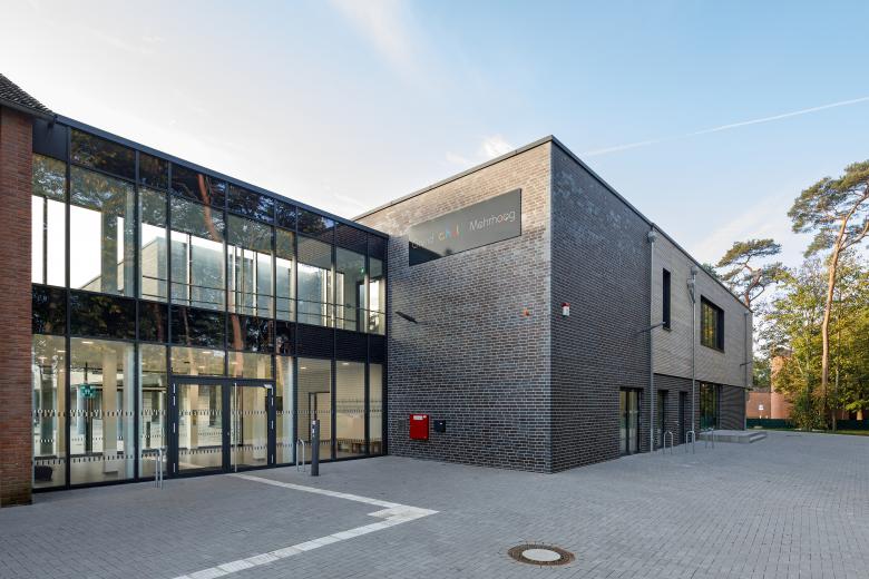 In Hamminkeln am Niederrhein ist ein Ersatzneubau für die Grundschule Mehrhoog am Standort der Offenen Ganztagsschule entstanden. Mit dem Neubau wurde die Schule auf drei Züge vergrößert. Der Neubau wurde mit dem Raumkonzept der Cluster-Schule geplant und umgesetzt. Die Lern- und Aufenthaltsbereiche in den jeweiligen Clustern bieten den Lehrern und den Schülern zusätzliche, individuell nutzbare Flächen. Insgesamt befinden sich auf rund 3.700 Quadratmetern zwölf neue Klassenräume sowie vier Fachräume im Gebäude. Der Ersatzneubau besteht aus einem zweigeschossigen Hauptgebäude mit Schule und Verwaltung sowie einem verglasten Verbindungstrakt zwischen Neu- und Bestandsbau, der gleichzeitig als Haupteingang fungiert. Das Obergeschoss des neuen Gebäudes ragt zum Teil in den Schulhof hinein und bietet so einen überdachten Bereich, der in der Pause Schutz vor schlechtem Wetter bietet. Die Fassade wirkt freundlich und einladend: im Erdgeschoss mit zweifarbigen Klinkerriemchen, als Verbindung zwischen Bestand und Neubau, im Obergeschoss mit einer Holzlamellenbekleidung. Die Fenster und Fenstertüren sind aus wetterresistentem Aluminium. In Kombination mit der „naturbelassenen“ Holzlamellenbekleidung entsteht ein harmonischer und moderner Gesamteindruck.