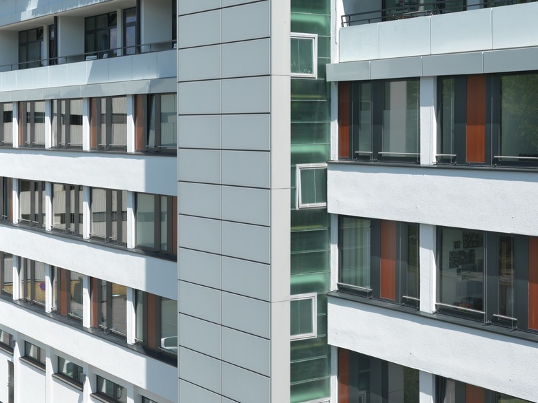 Die Ladenfassaden im Erdgeschoss öffnen sich mit großzügigen Glasflächen zum Außenraum. Die vorwiegend als Büros und Praxen genutzten Mieteinheiten in den Obergeschossen erhalten eine neue anthrazit-farbene Fassadenbekleidung.