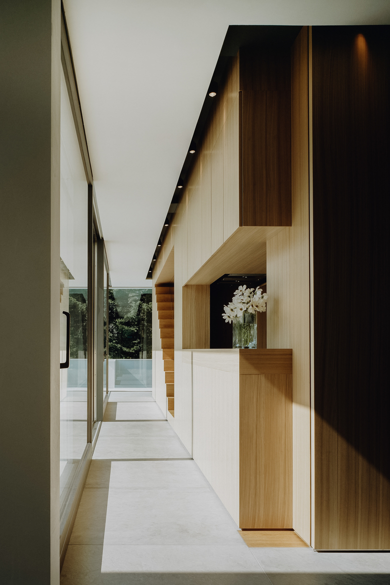 Eine weitere praktische Einrichtung ist die sogenannte Schmutzschleuse, der Familieneingang, der parallel zum Haupteingang angeordnet ist. Jedes Kind hat hier einen eigenen Spind, in dem Schuhe, Jacken und Taschen verschwinden bevor der Wohnraum betreten wird. Ein großes Waschbecken sorgt zusätzlich dafür, dass der gröbste Schmutz draußen bleibt. Purismus in der familienfreundlichen Version.