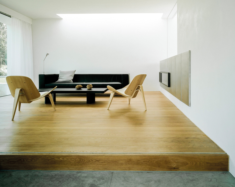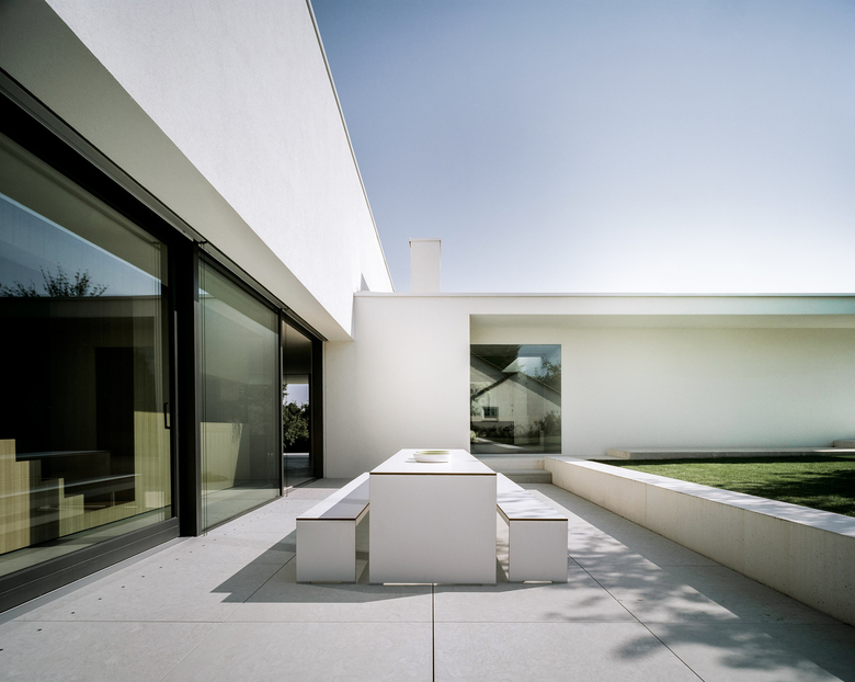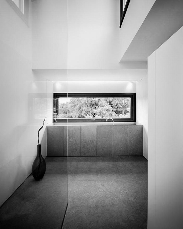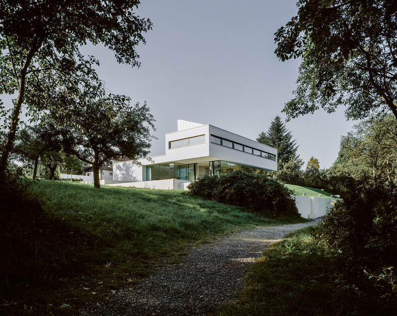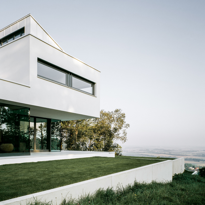 Wenige, handverlesene Materialien wie der hellgraue, spanische Sandstein, Ryster- bzw. Eichenholz und glatte weiße Putzflächen bestimmen die asketische Architektur. Purismus, der sich bis in die Gestaltung des Gartens zieht. Weiße Sichtbetonmauern umfassen und terrassieren schlichte, rechteckige Rasenflächen. Nur am Eingang steht ein alter, windschiefer Birnbaum mitten im Rasen.