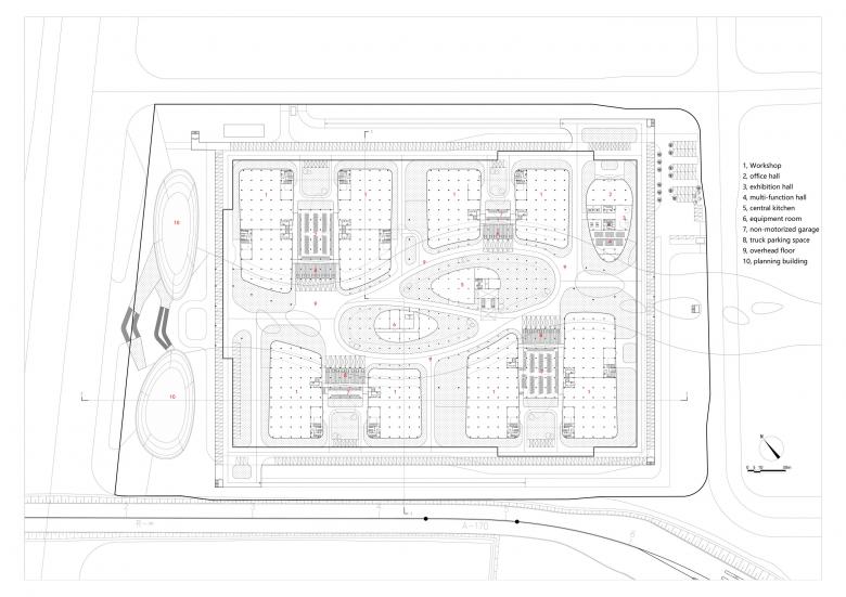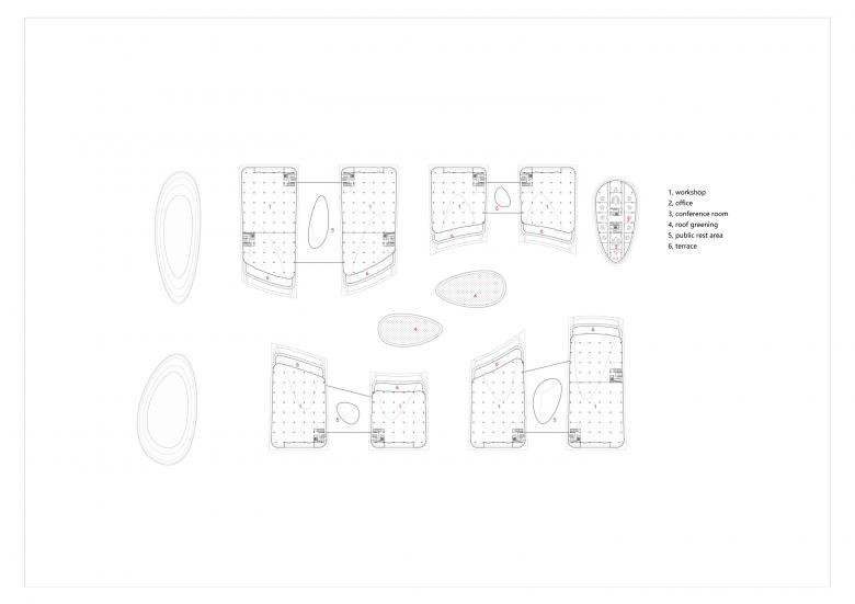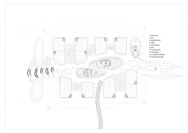 The pedestrian traffic line in the factory area is differentiated inside and outside according to different functions, and does not overlap with the vehicle traffic line, so that people and vehicles are separated from each other. Outside Purposeful Arrival: The pedestrian flow inside the base comes to the foyer of each single building on the first floor of the plant through the vertical traffic of the four corners. Inside leisure stroll: the east-west landscape leisure axis connects the whole factory area, and the offices of each single building can come to the landscape walkway smoothly through the landscape terrace.
