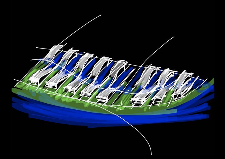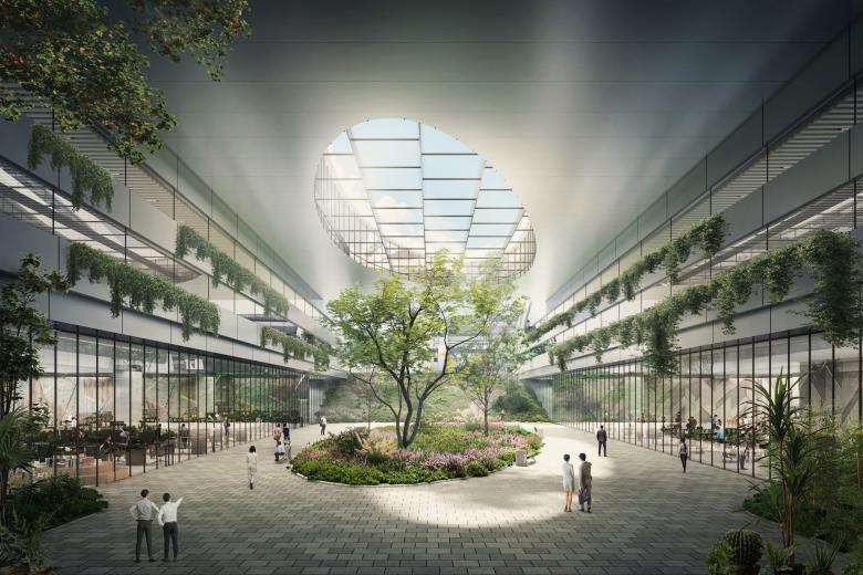 Peripheral people flow arrives through public transport and comes to the interior of the superstructure industrial park through the vertical traffic at the ends and corners of the landscape axis. A green landscape walking green valley is planned in the middle of the base, which is open to the city, organically connecting the mountain, the city, and the sea with the project base, creating a shared urban axis from the mountain to the sea.