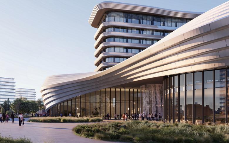 Characteristics of the form: large S-curve building profile + inward-looking courtyard. The isolated shape of the building intentionally distances the building from the elevated area to reduce the impact of noise, and the inward-looking courtyard creates a suitable internal space. The hotel and the exhibition are each equipped with an inward-looking courtyard, creating a private internal space experience, isolating the busy flow of people from the hospital outside and creating a comfortable space experience.