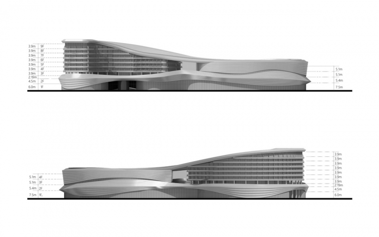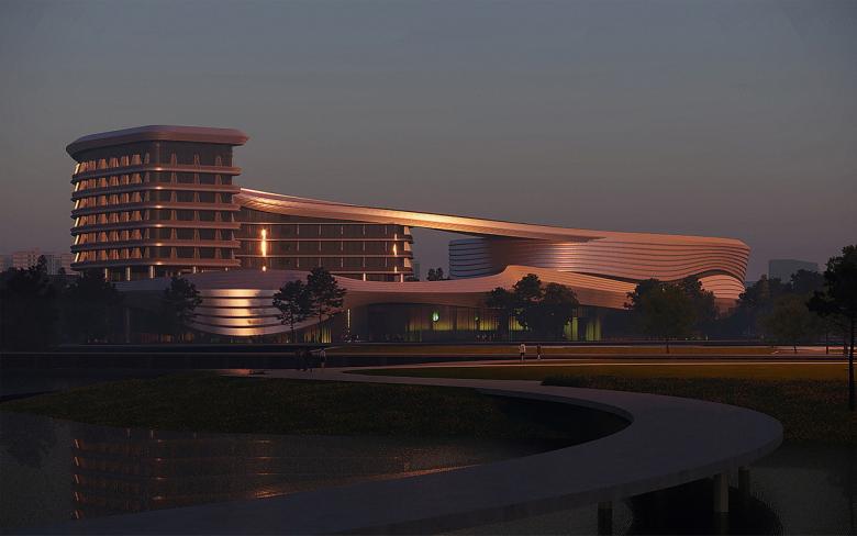 Elevation design: the overall building elevation conception of the mountain as a shape, water as a meaning, the soft curves of the surrounding natural landscape is used in the elevation design vocabulary. The contrast between reality and reality is used to create a sculptural architectural form, with horizontal wavy lines and a modern minimalist style that echoes and coordinates with the surrounding buildings in the park. The dynamic pleated curved aluminium panels wrap the hotel and conference centre, enhancing the integrity of the building and highlighting the new height of the Eye Valley development. The lighting design considers both daily and event celebration modes