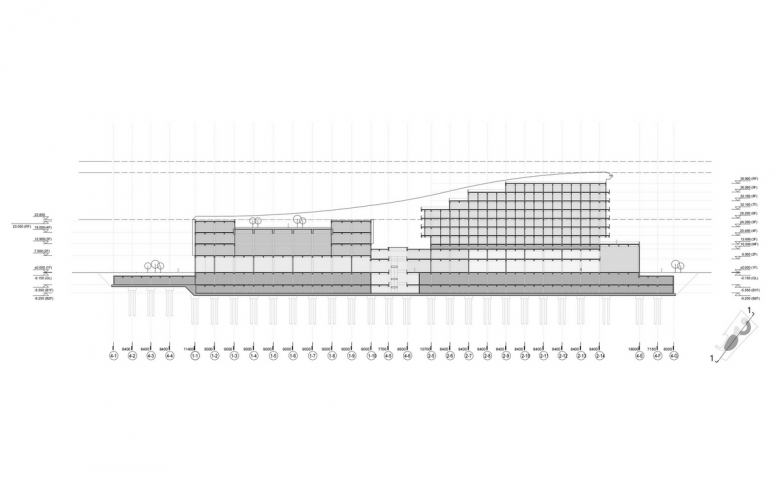 Functional combination: This project has two basement levels below the main building, overlapping the upper and lower levels. The first and first floors of the hotel are equipped with ancillary rooms, and 250 rooms are set up on the third to ninth floors. The ground floor of the exhibition centre is for exhibition halls, and the second to fourth floors are for conference centre functions, of which the main venue can accommodate 1,500 people.