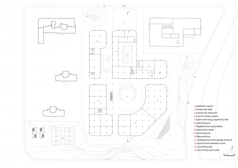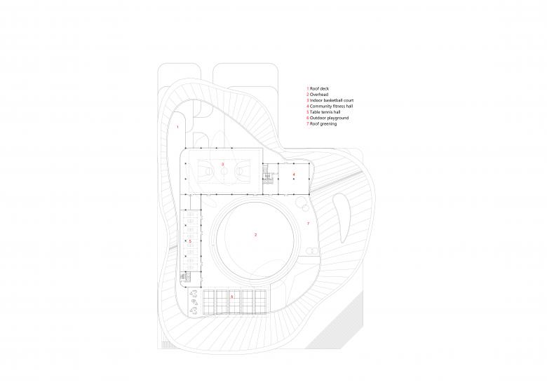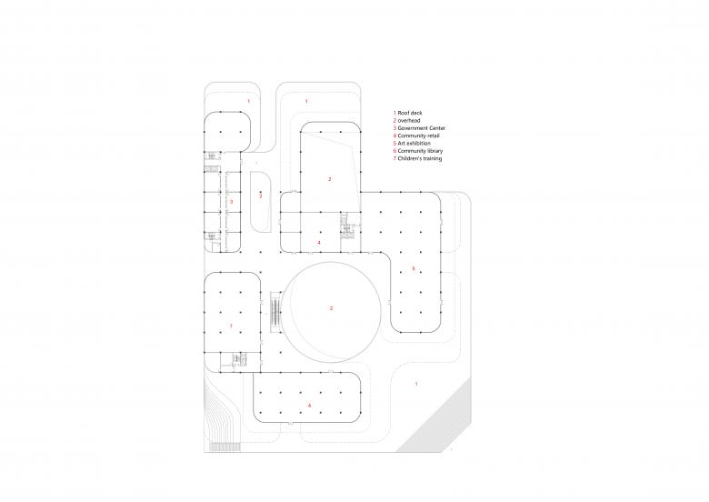 Scenario Generation - After using area to determine the volume, the space is cut up through the dynamic line, and landscape retreats are created to create a multi-first floor traffic system and three-dimensional landscape, ultimately forming a narrative space dominated by flow. The functional layout sets up seven scenarios: public space for citizens, fitness centre, training centre, arts and culture exhibition centre, community government centre, community convenience centre and community commerce. The whole forms a mixed block with complex functions. The plan adopts standardised unit design, flexible layout and sharing of functions, and sustainable operation.