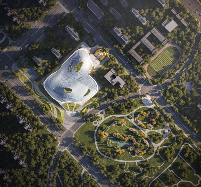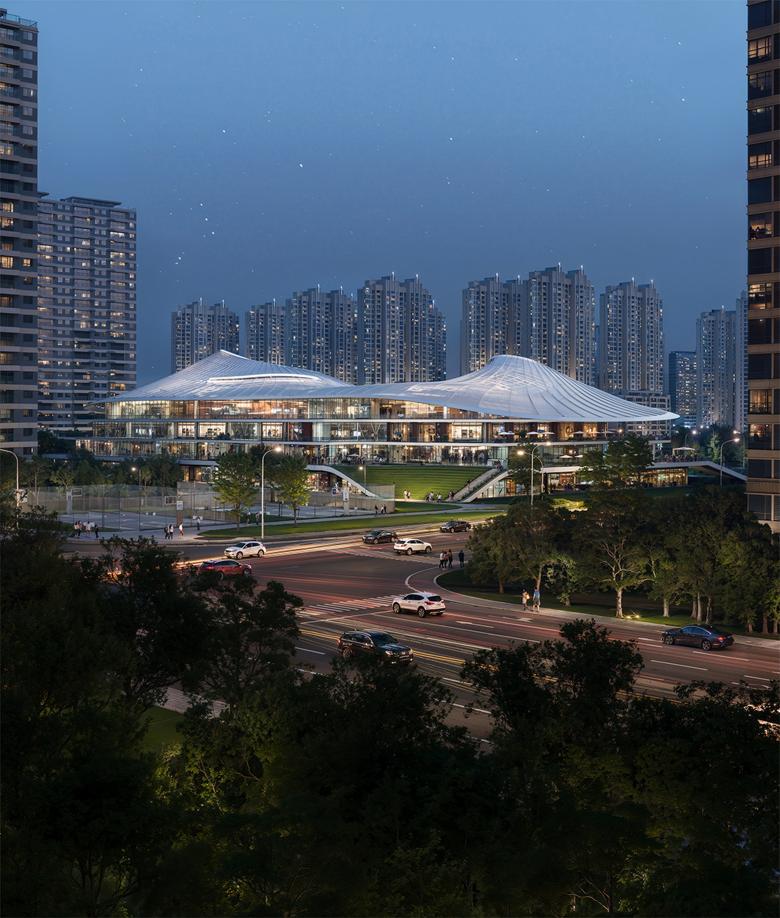 The second IP of this case: Harmony and Symbiosis - the form of the building is intended to reflect the integration of ancient and modern times, like a group of people holding hands in the dance of harmony. The building and the park are looking at each other, and together they form the open centre of the community. The roof form is as gentle as water, dancing with harmony in a rounded manner.